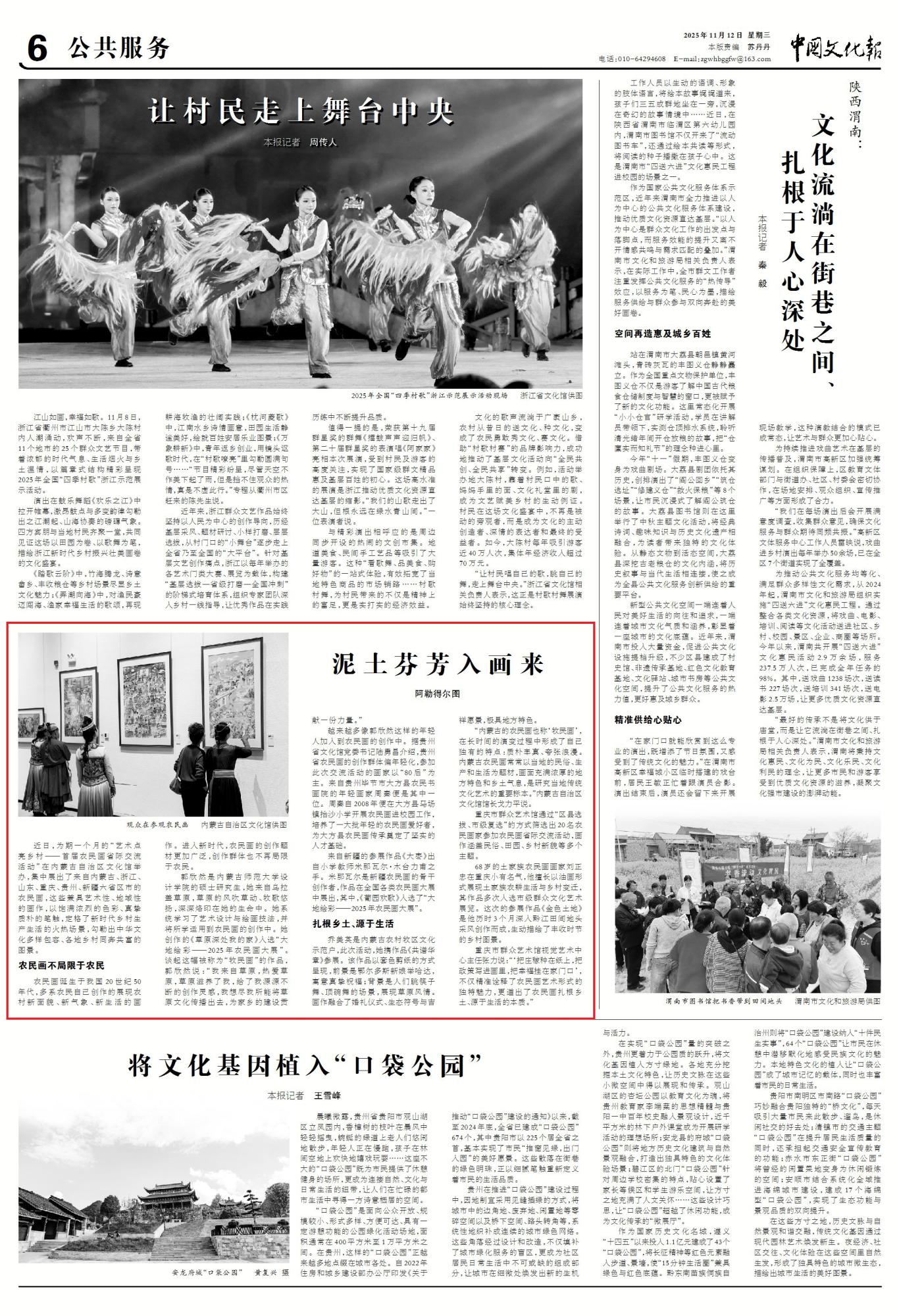 2025年11月12日,《中国文化报》第6版刊发题为《泥土芬芳入画来》的文章,报道了近日,为期一个月的“艺术点亮乡村——首届农民画省际交流活动”在内蒙古自治区文化馆举办,集中展出了来自内蒙古、浙江、山东、重庆、贵州、新疆六省区市的农民画,这些兼具艺术性、地域性的画作,以饱满浓烈的色彩、真挚质朴的笔触,定格了新时代乡村生产生活的火热场景,勾勒出中华文化多样包容、各地乡村同奔共富的图景。