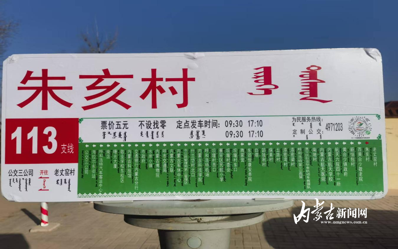 从11月11日起,113路将于每日早晚各一趟,定点延伸至老丈窑村。新延伸的线路共增设3个站点,其中,上行停靠(路南)赛音不浪村;终点站设在老丈窑村(到达时间09:20、17:00左右);下行停靠(路北)朱亥村(到达时间09:30、17:10左右)。