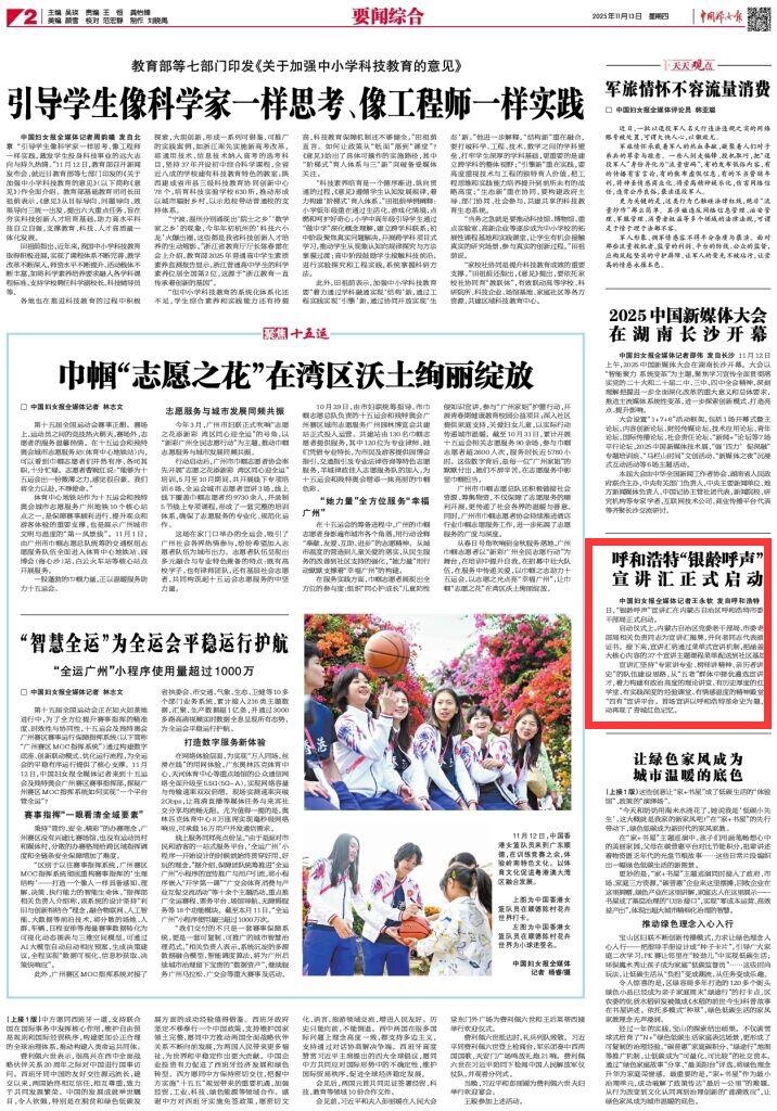 2025年11月13日,《中国妇女报》第2版刊发题为《呼和浩特“银龄呼声”宣讲汇正式启动》的文章,报道了近日,“银龄呼声”宣讲汇在内蒙古自治区呼和浩特市委老干部局正式启动。