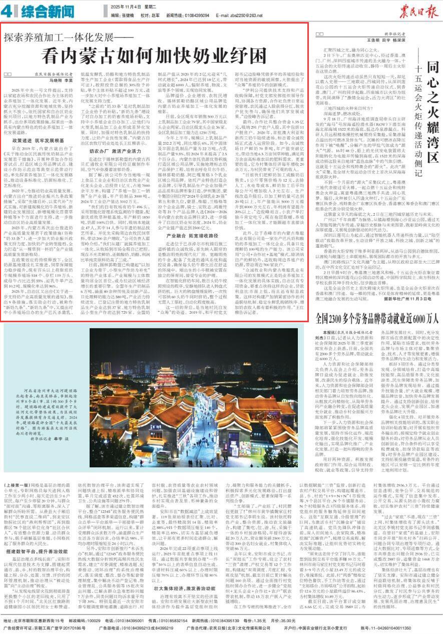 2025年11月4日,《农民日报》第4版刊发题为《探索养殖加工一体化发展——看内蒙古如何加快奶业纾困》的文章,报道了内蒙古充分挖掘资源和地域优势,坚持抓大不放小,依托国家和自治区奶业振兴项目,以地方特色乳制品产业为抓手,出台多项政策措施,探索出一条具有内蒙古特色的奶业养殖加工一体化发展道路。
