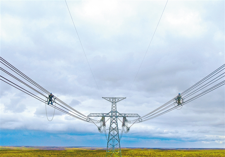 国网蒙东电力技术人员在特高压电网±800千伏昭沂直流线路开展检修作业。 张志国 摄