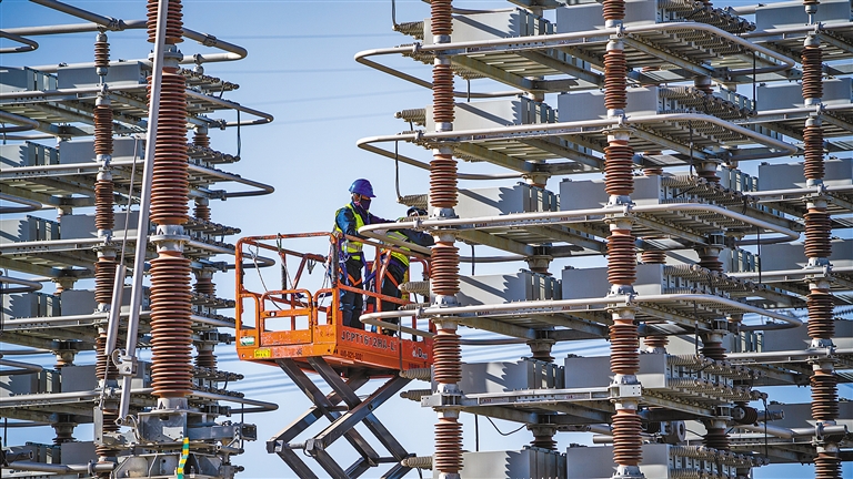 国网蒙东电力检修人员在±800千伏伊克昭换流站交流滤波器场开展电容器接头螺栓紧固工作。张浩文 摄