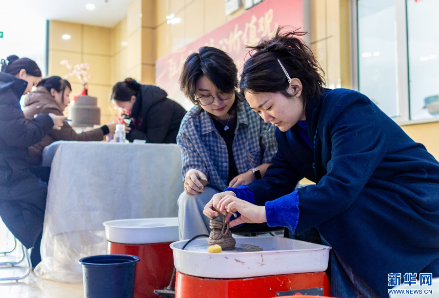 11月16日,呼和浩特市玉泉区残疾人职业技能竞赛陶艺互动体验区,市民在学习制作陶艺。新华网发(丁根厚 摄)