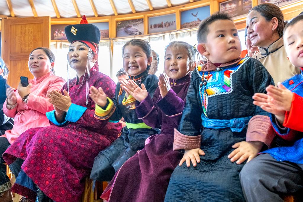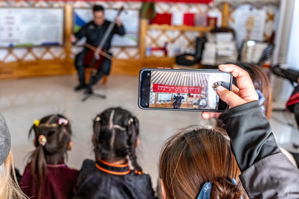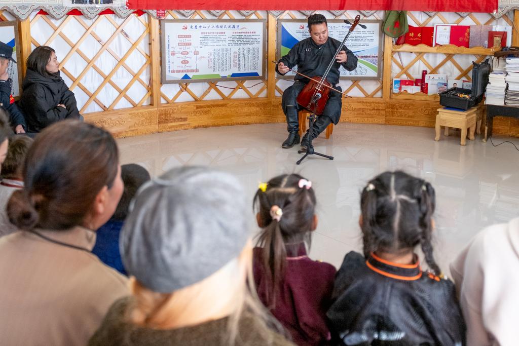 11月12日,在内蒙古锡林郭勒盟苏尼特右旗额仁淖尔苏木吉呼郎图嘎查赛音巴特尔护边驿站,“小小乌兰牧骑”的演员们在“送欢乐、送文明”基层服务活动中表演。