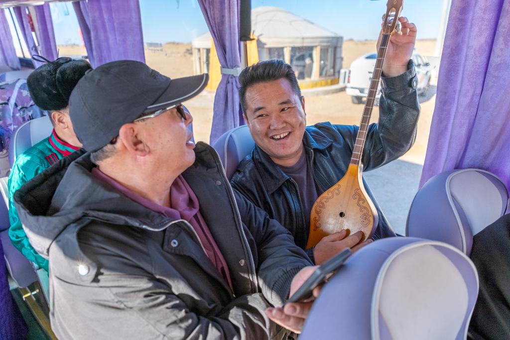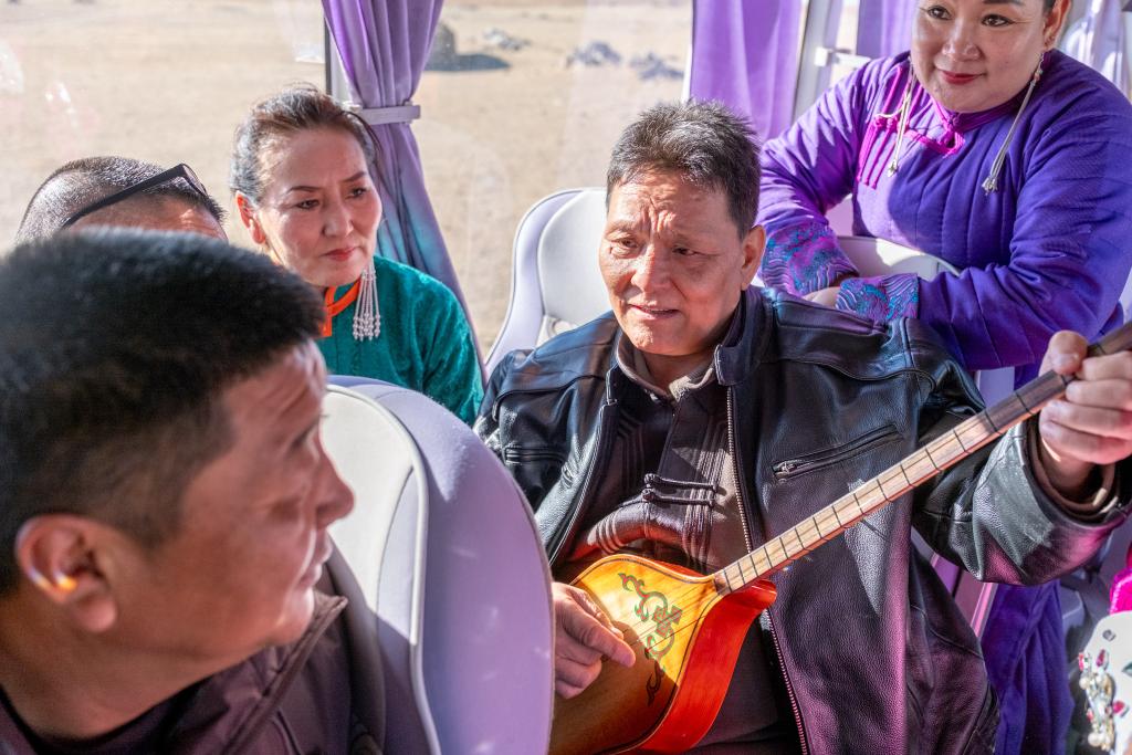 11月12日,乌云吉日嘎拉在大巴车上向其他演员演示乐器弹奏技巧。