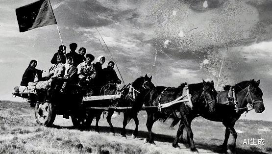 20世纪50年代,苏尼特右旗乌兰牧骑的演员们乘马车下乡演出。(AI复原动图)