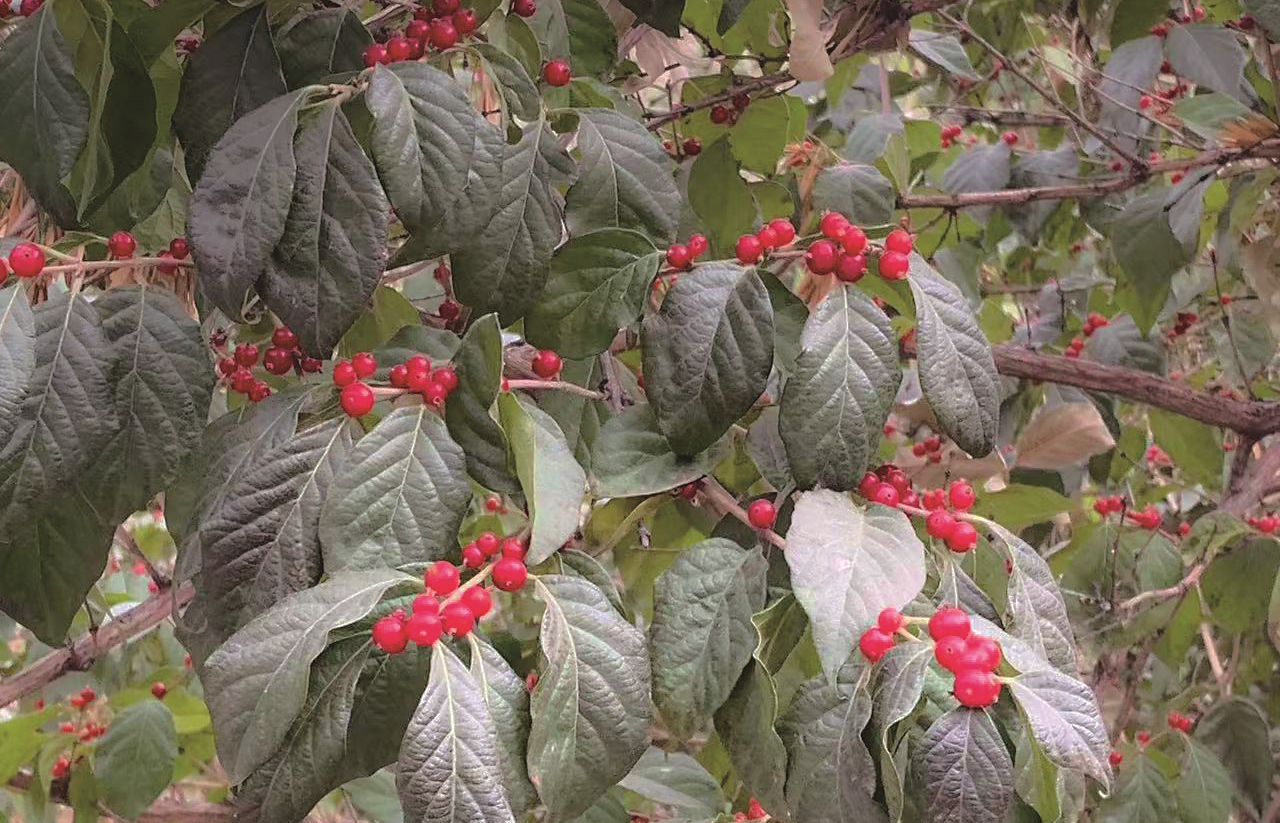 入冬后,红红的忍冬果实挂满枝头,为冬季的街头增添了一抹亮色。 ( 李宇桥)