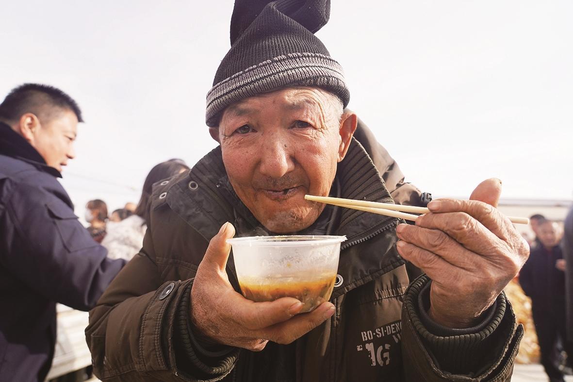 巡游的锣鼓尚未远去,灶台边的香气已抢先“出圈”。院中的几口大铁锅里,新鲜的年猪肉、手工酸菜与新收获的旱地土豆在一起翻滚沸腾。掌勺的“村厨”们挥铲如飞,油光锃亮的肉块与吸饱汤汁的酸菜碰撞出浓郁香气。人们捧着杀猪烩菜就着刚蒸好的馒头大快朵颐,热乎气儿糊在脸上:“这才是地道的乡土滋味”。热闹当然不止于舌尖。乌兰牧骑的队员们跳起热闹欢快的秧歌,高亢嘹亮的山曲儿越过寒风飘荡在乡村。烟火升腾处,是乡村民俗的回归,更是乡村振兴的脉动。