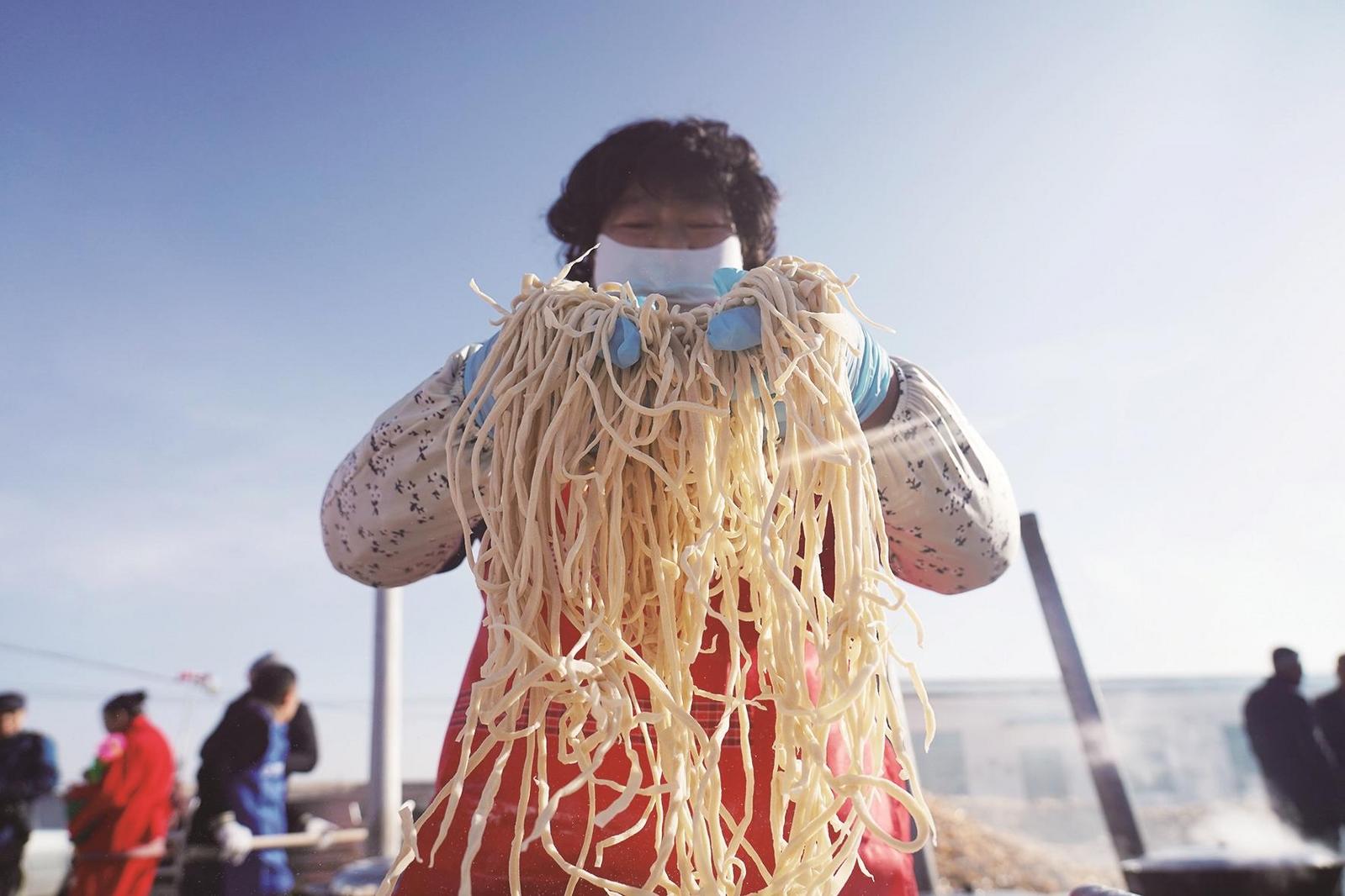 村民自制手工石磨面条。