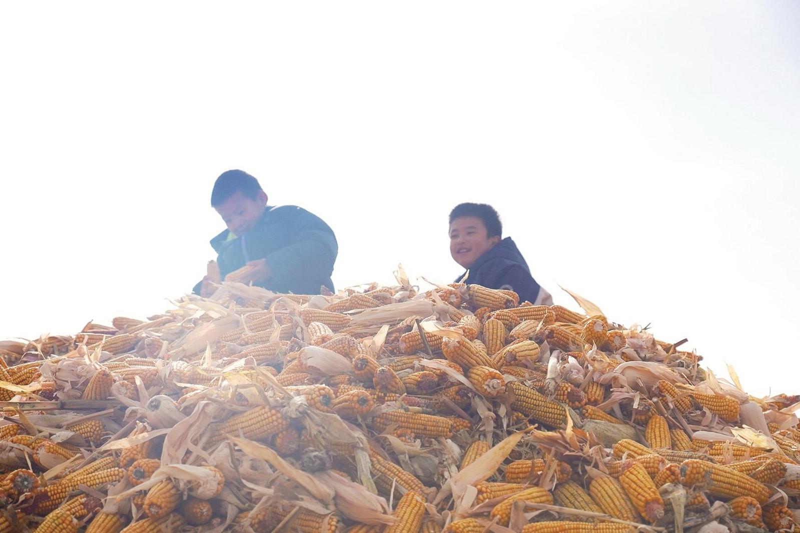 玉米垛上开心的孩子。
