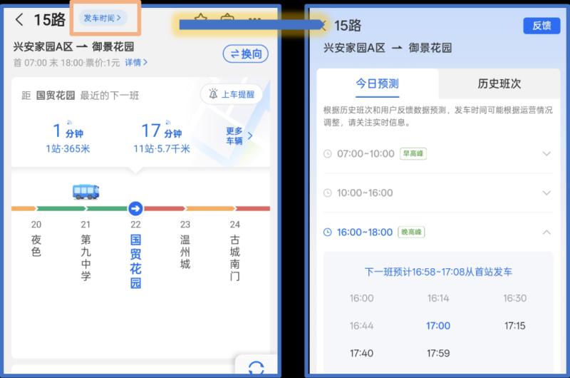 线路详情页的左上角,点击“发车时间”即可看到全天的车辆班次情况,结合历史发车和实际路况,精准计算发车时间,再也不怕错过公交车啦~