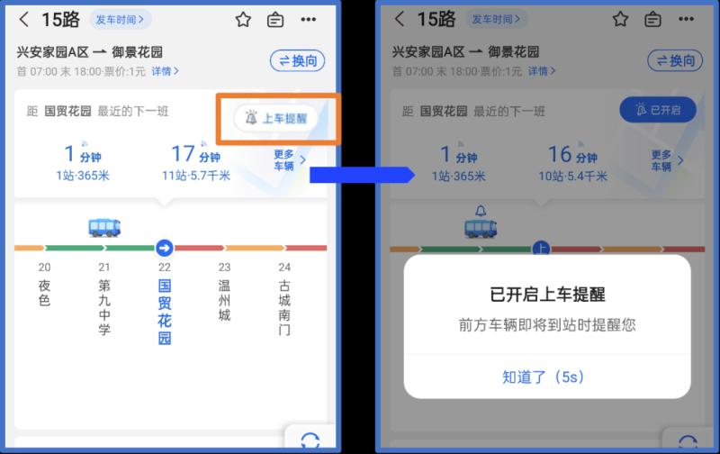 线路详情页可以设置语音+震动提醒,车快到站可设置上车提醒;接近目的地可设置下车提醒,以便提前为上下车做好准备。