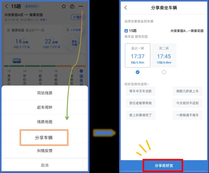 【车辆分享】功能可以把您乘坐或即将乘坐的公交车分享给家人或朋友,让他们掌握您的实时行程,伴您安全到达。