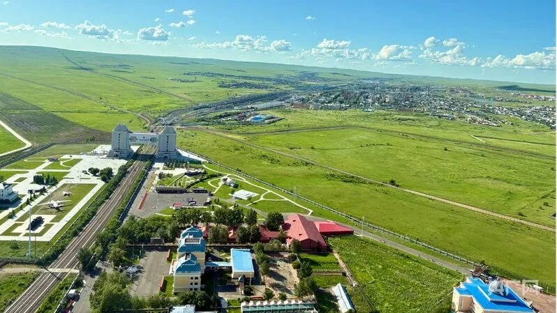 俯瞰位于满洲里的中俄边境线,草原广袤,口岸建筑与铁路纵横交错(央广网记者 李春雪 摄)