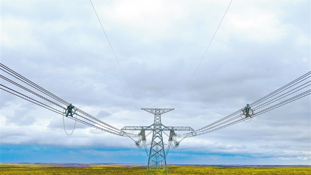 国网蒙东电力技术人员在特高压电网±800千伏昭沂直流线路开展检修作业。张志国 摄