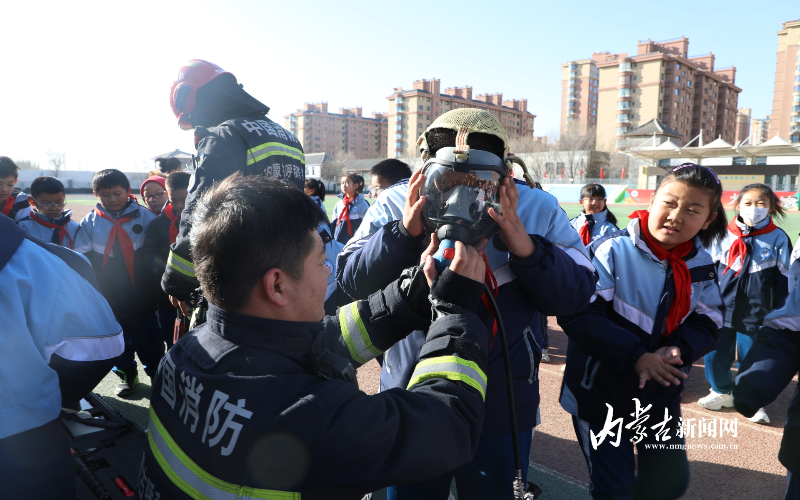 “现在摆在大家面前的是常用到的3种灭火器,分别是二氧化碳灭火器、水基型灭火器、干粉灭火器……”操场中央,来自玉泉区南二环路消防救援站的消防员格日勒图现场细致讲解灭火器的使用要点,“提瓶身、拔保险、握喷管、压手柄,对准火焰根部精准喷”,口令清晰好记,还手把手示范操作。孩子们听得格外认真,很快摸清核心要领,脸上满是专注。
