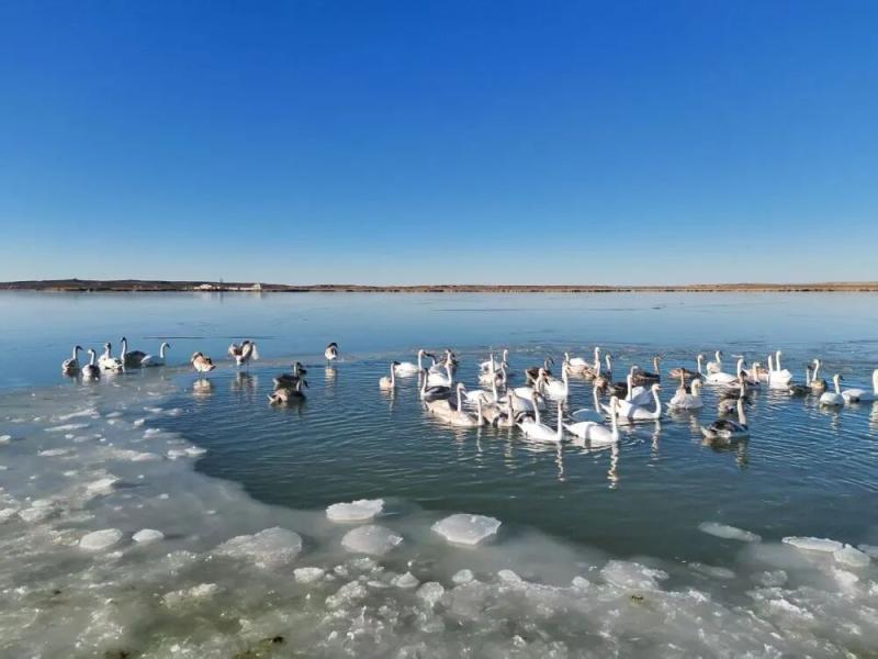 冬季的居延海水面已结起一层薄冰,但在湖中一片未上冻的区域,还有一群天鹅在嬉戏,迟迟不愿向南飞去。