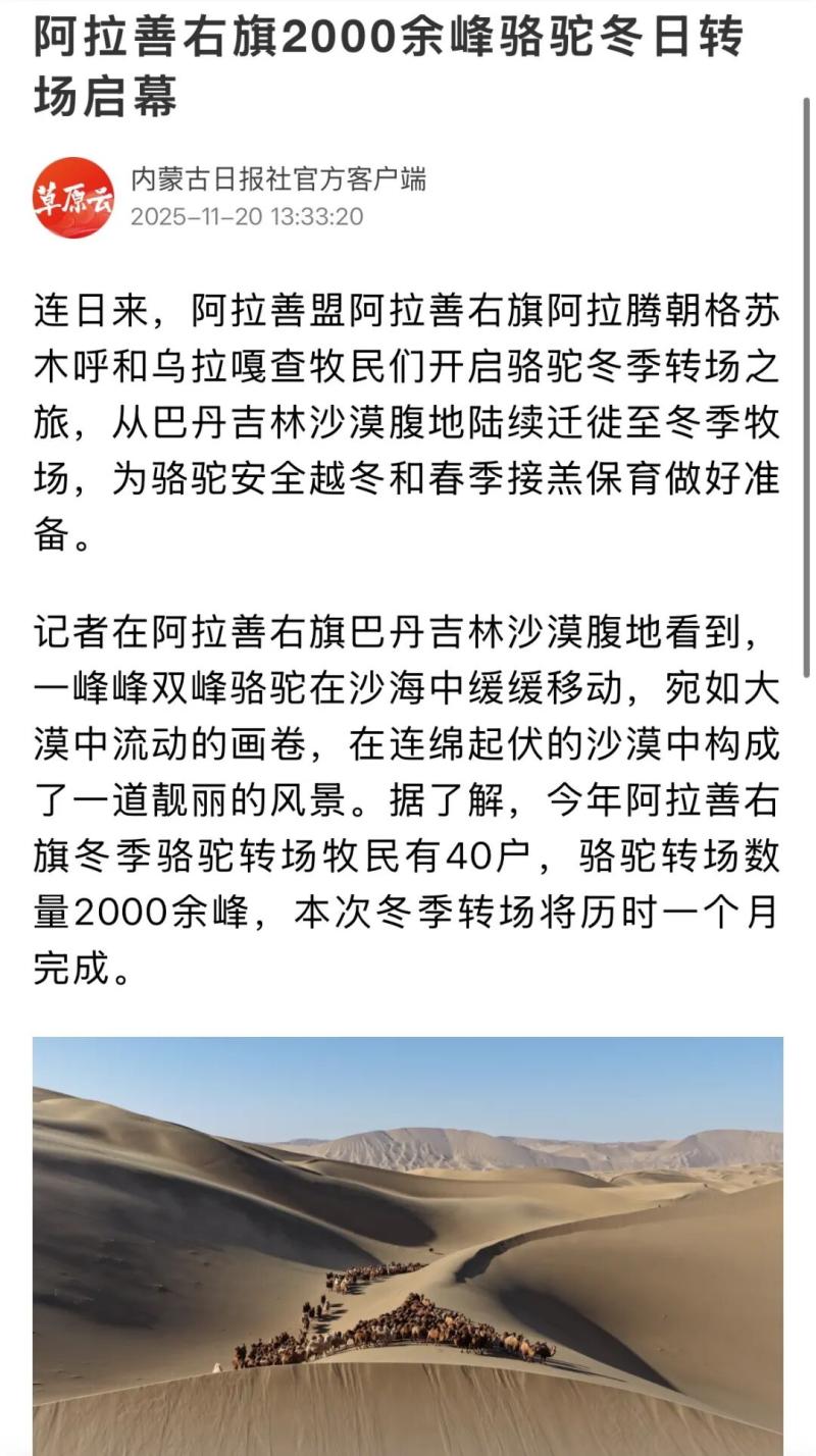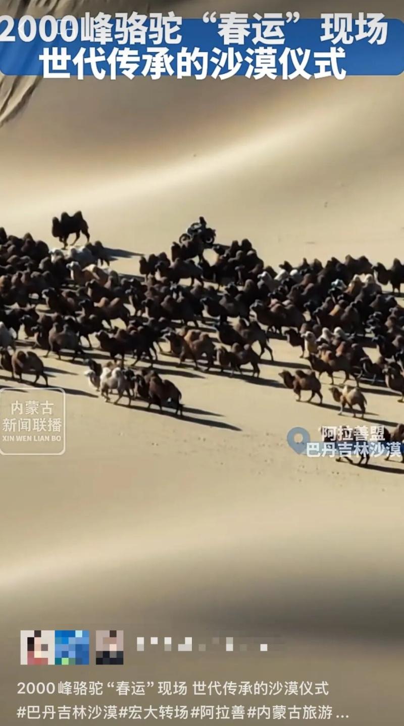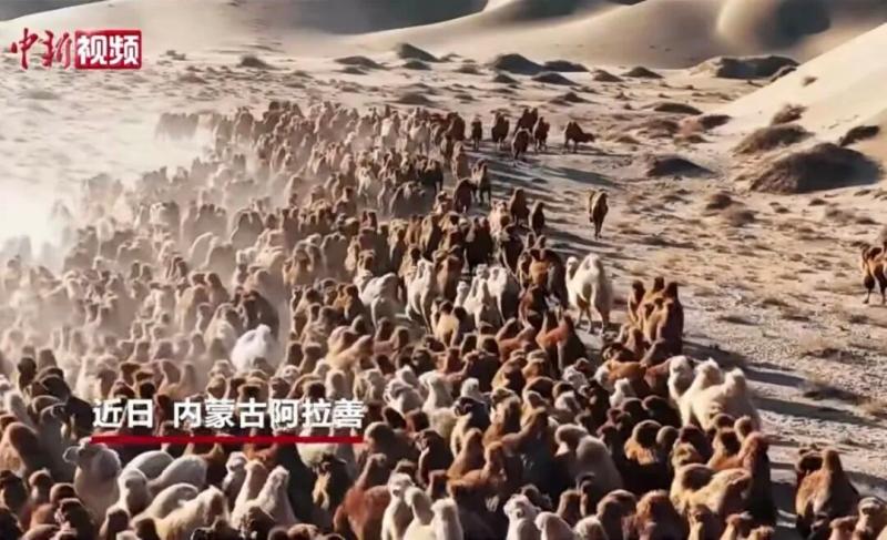 网友纷纷留言点赞:“大漠转场太震撼。”“沙海驼群如流动画卷,尽显大漠生机。”“这是人与自然和谐共生的生动写照。”“每年一度的双峰驼转场嘉年华,壮哉壮哉!”