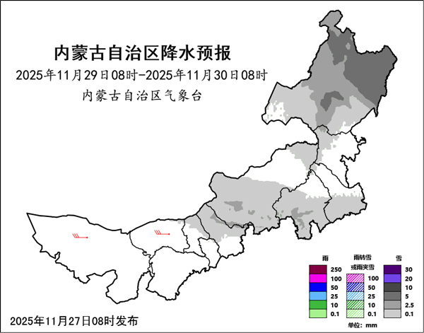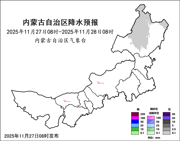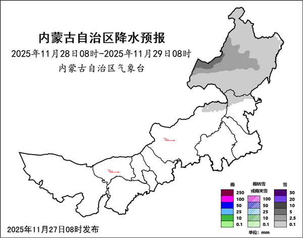 具体预报为,11月27日8时~11月28日8时,内蒙古东北部偏北地区多云,有分散性小雪;西部大部、中部偏西和偏南地区有4~5级短时6~7级偏西风;东部偏东地区气温继续下降。