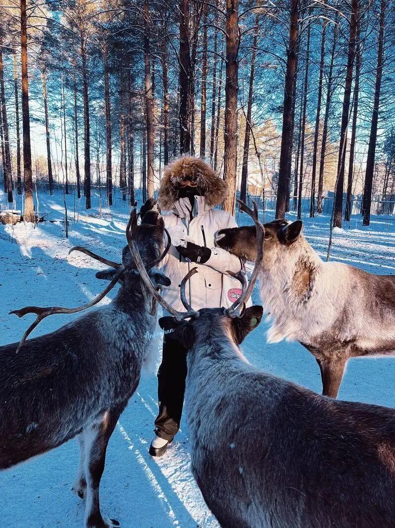 握着包浆温润的桦木鹿铃,“咚咚”的声响在松林间回荡,震得枝头雪粒“扑簌簌”地往下掉,落在肩头轻得像羽毛。布包里的盐块硌着手心,刚掰下一小块递出去,就被驯鹿湿软的鼻子蹭了蹭,凉丝丝、痒酥酥的,低头见小鹿正叼着盐块慢慢嚼,灰褐色的皮毛沾着雪,摸上去外层凉、内里却暖融融的。铜铃在耳边晃出清脆的“叮当”,松针的清香钻进鼻腔,铲鹿粪时,冻硬的粪便磕在铲子上“咔嚓”响,雪粒溅在靴筒上很快化了,指尖沾到的干草带着松林的潮气,整个过程没有刻意的互动,却满是触手可及的温柔。