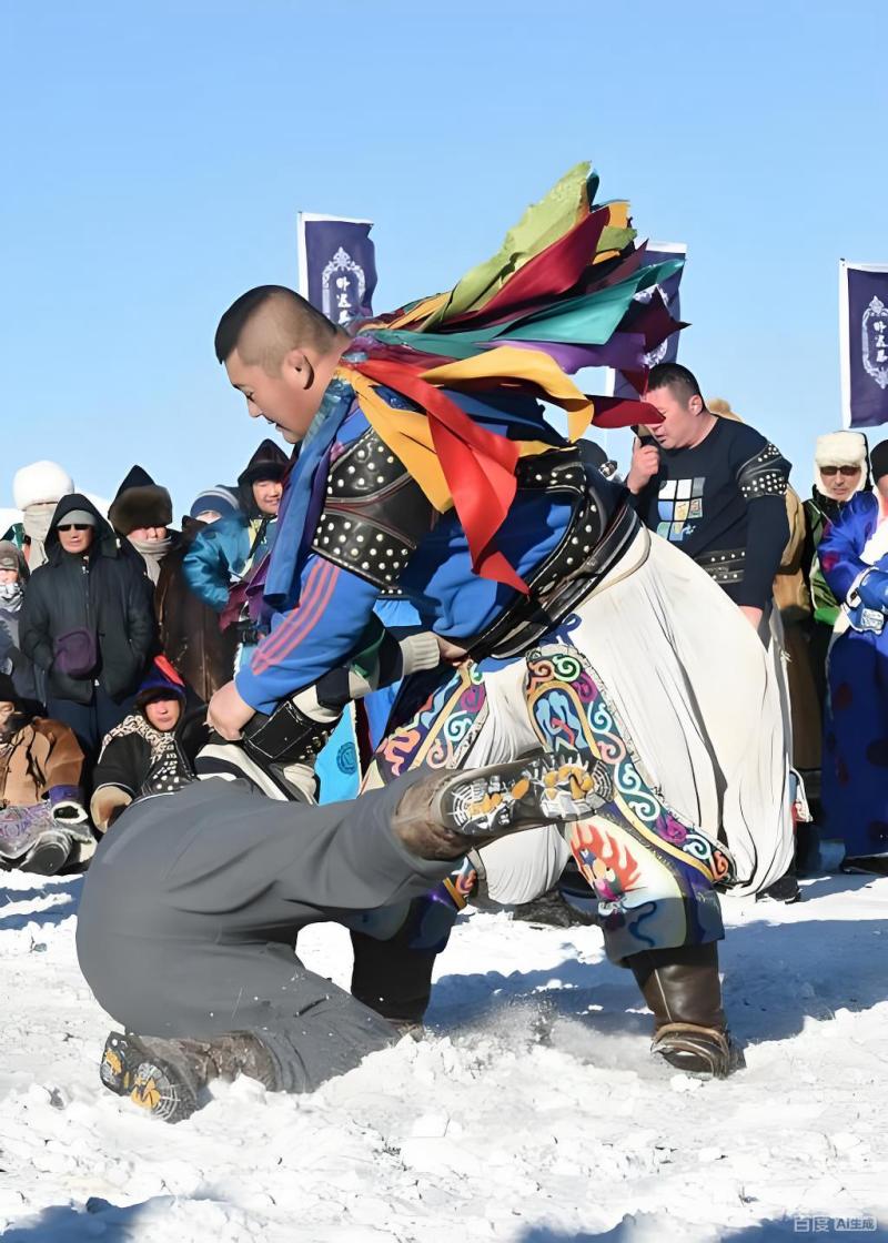 “开始!”裁判一声令下,两位摔跤手瞬间扭在一起,双手紧紧抓住对方的坎肩,肌肉绷起的线条在雪光下格外分明。他们时而沉稳对峙,时而借力发力,“勾脚绊”“锁肩摔”等技法干脆利落,没有花里胡哨的修饰,每一招都直指胜负。当一方借腰腹之力将对手掀翻在地,雪地里溅起大片雪沫,全场立刻炸开喝彩声,蒙古语的欢呼声响彻雪原,与马头琴的旋律交织在一起,热烈而纯粹。