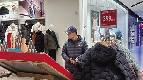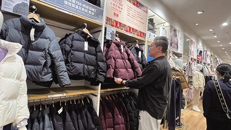 在男装区,市民张先生正在试穿一件加绒冲锋衣,他告诉记者:“我平时骑电动车上下班,风一吹特别冷。这件冲锋衣不仅防风保暖,里面的加绒内胆还能拆卸,春秋季也能穿,很实用。”