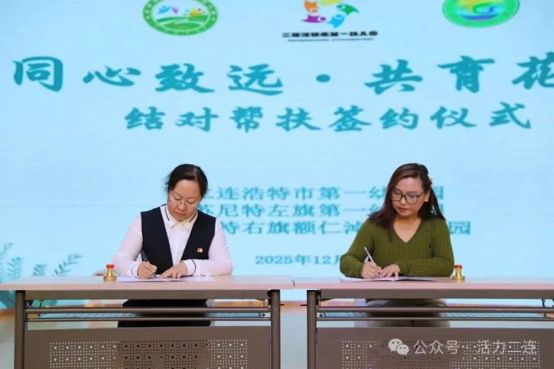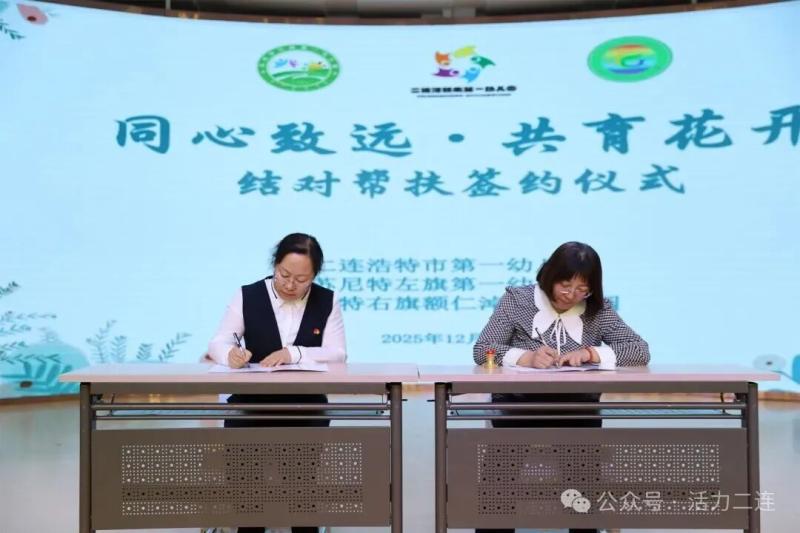 12月2日,一场跨越地域的教育牵手,让冬日的暖阳在校园绽放光彩。二连浩特市第一幼儿园与苏尼特左旗第一幼儿园、苏尼特右旗额仁淖尔幼儿园“一市两旗”幼教同仁欢聚一堂,以“同心致远·共育花开”为主题,举行结对帮扶签约仪式,携手开启共建共育新篇章。