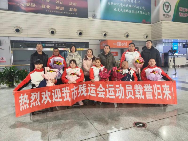 12月4日晚,代表自治区前往广州参加全国第十二届残疾人运动会暨第九届特殊奥林匹克运动会的6名通辽运动员乘机凯旋。通辽市残联相关工作人员及运动员家属早早前往机场等候,手持鲜花,热情迎接。