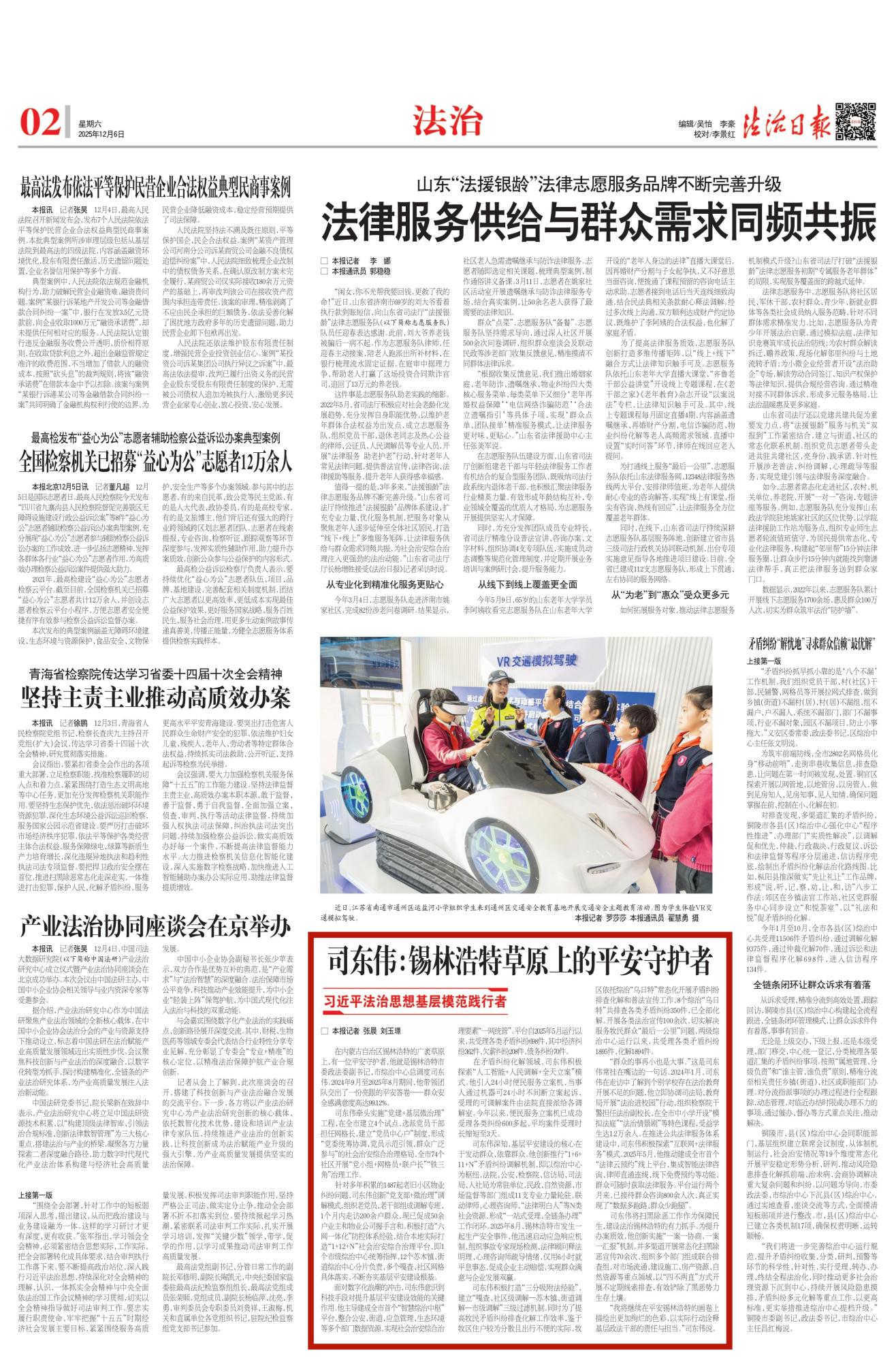 2025年12月6日《法治日报》第2版刊发了《司东伟:锡林浩特草原上的平安守护者》的文章,报道了内蒙古自治区锡林浩特市委政法委副书记、市综治中心总调度司东伟带领团队交出了一份亮眼的平安答卷——群众安全感满意度高达99.12%。