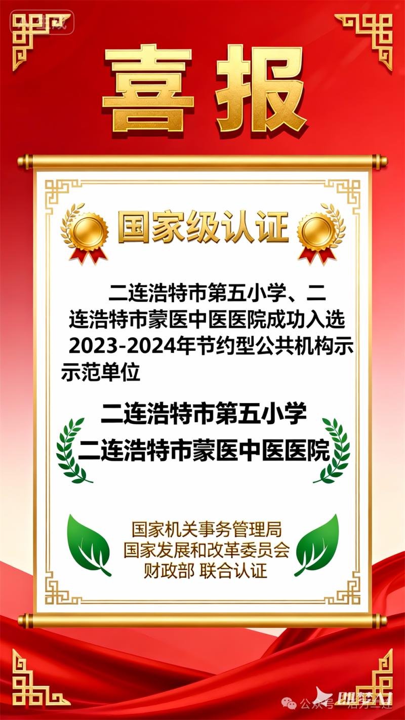 近日,国家机关事务管理局、国家发展和改革委员会、财政部联合印发《关于公布2023-2024年节约型公共机构示范单位和能效领跑者名单的通知》,二连浩特市第五小学、二连浩特市蒙医中医医院成功入选“2023-2024年节约型公共机构示范单位”,获国家级荣誉认可。