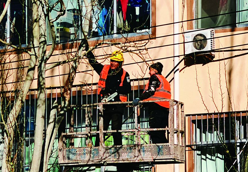 近日,在集宁区民建大街实验小学附近的行道树养护现场,两名绿化工人站在云梯车操作平台上,在交错树枝间小心穿梭。他们手持专业工具,精准修剪与电线缠绕的枝条及枯萎腐烂的枯枝败叶,每个动作都细致谨慎——既为优化树木生长形态,更为消除枯枝掉落伤人的安全隐患。