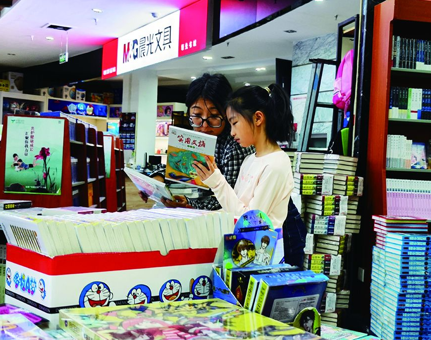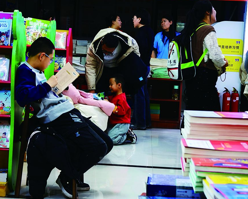 家长陪孩子在书店选书 鲍娜 摄