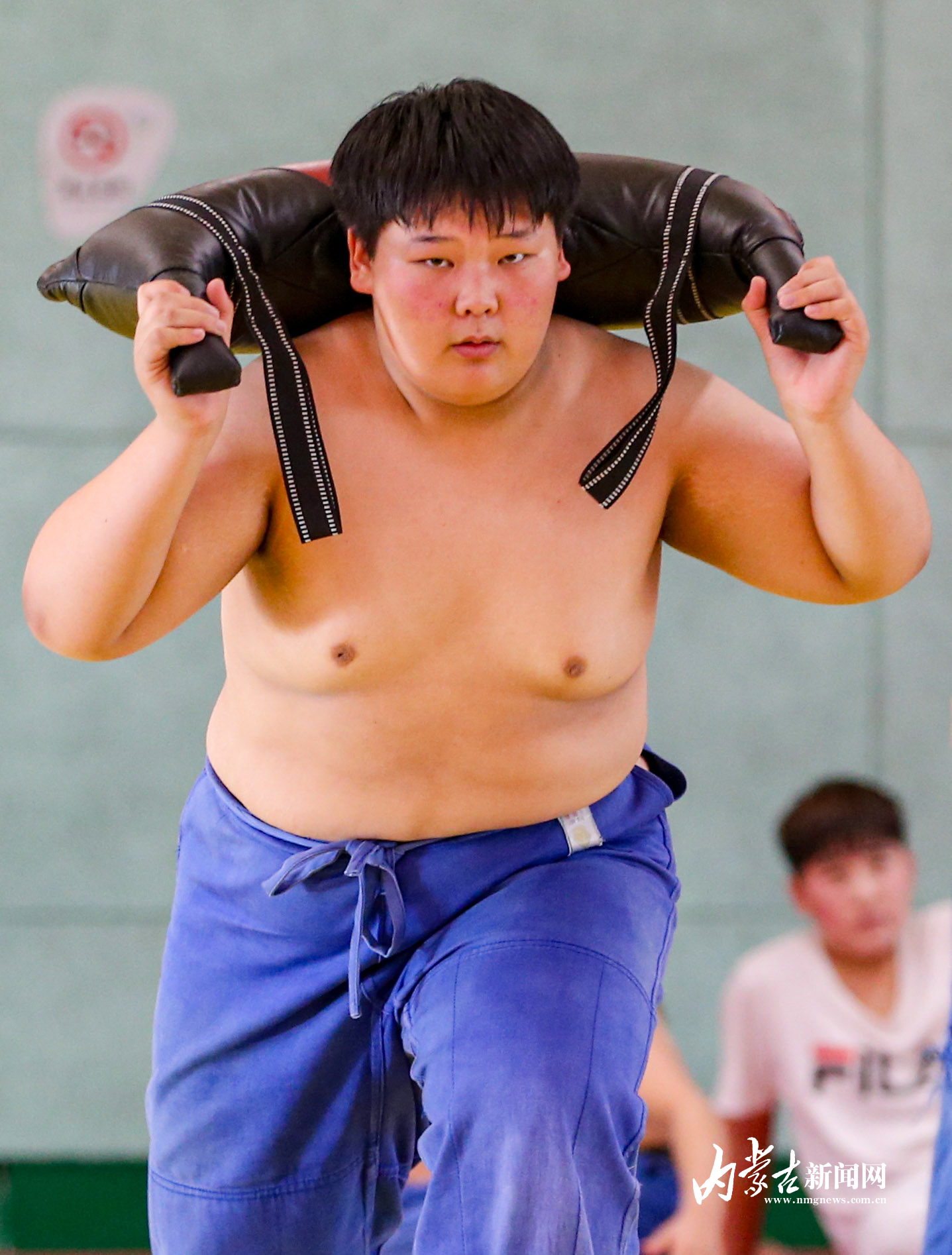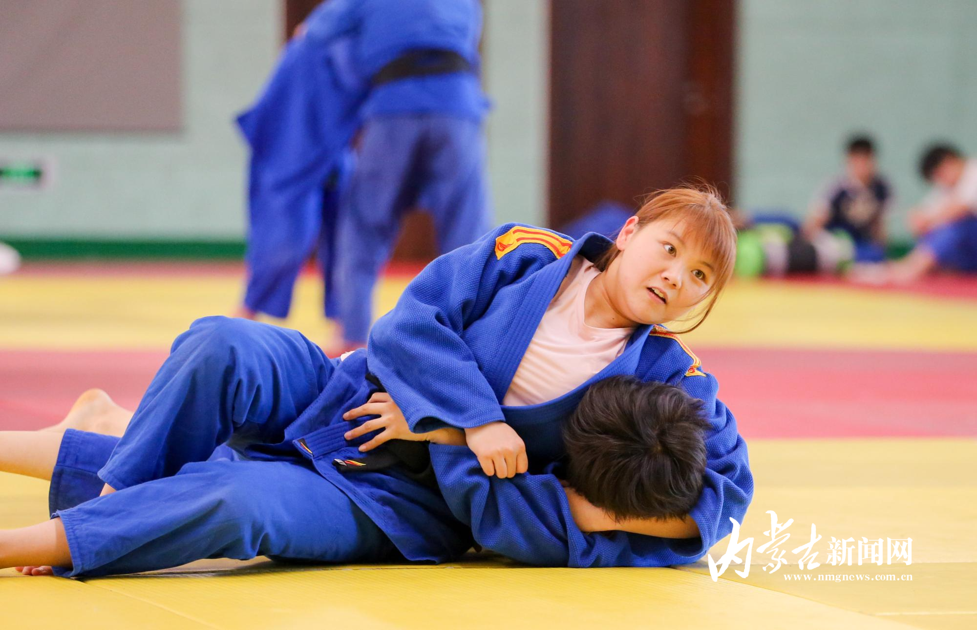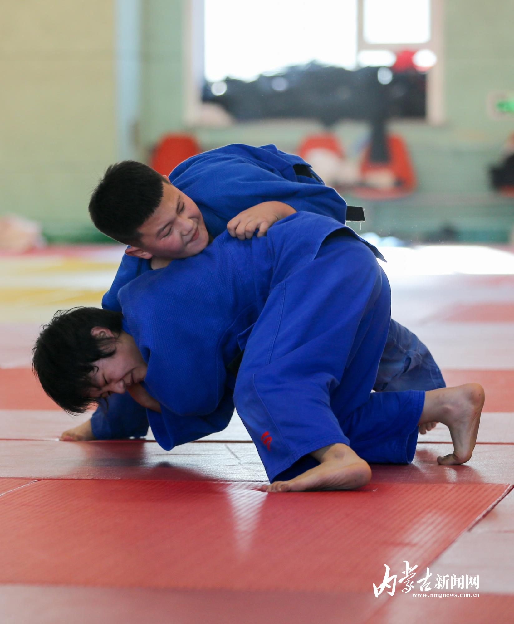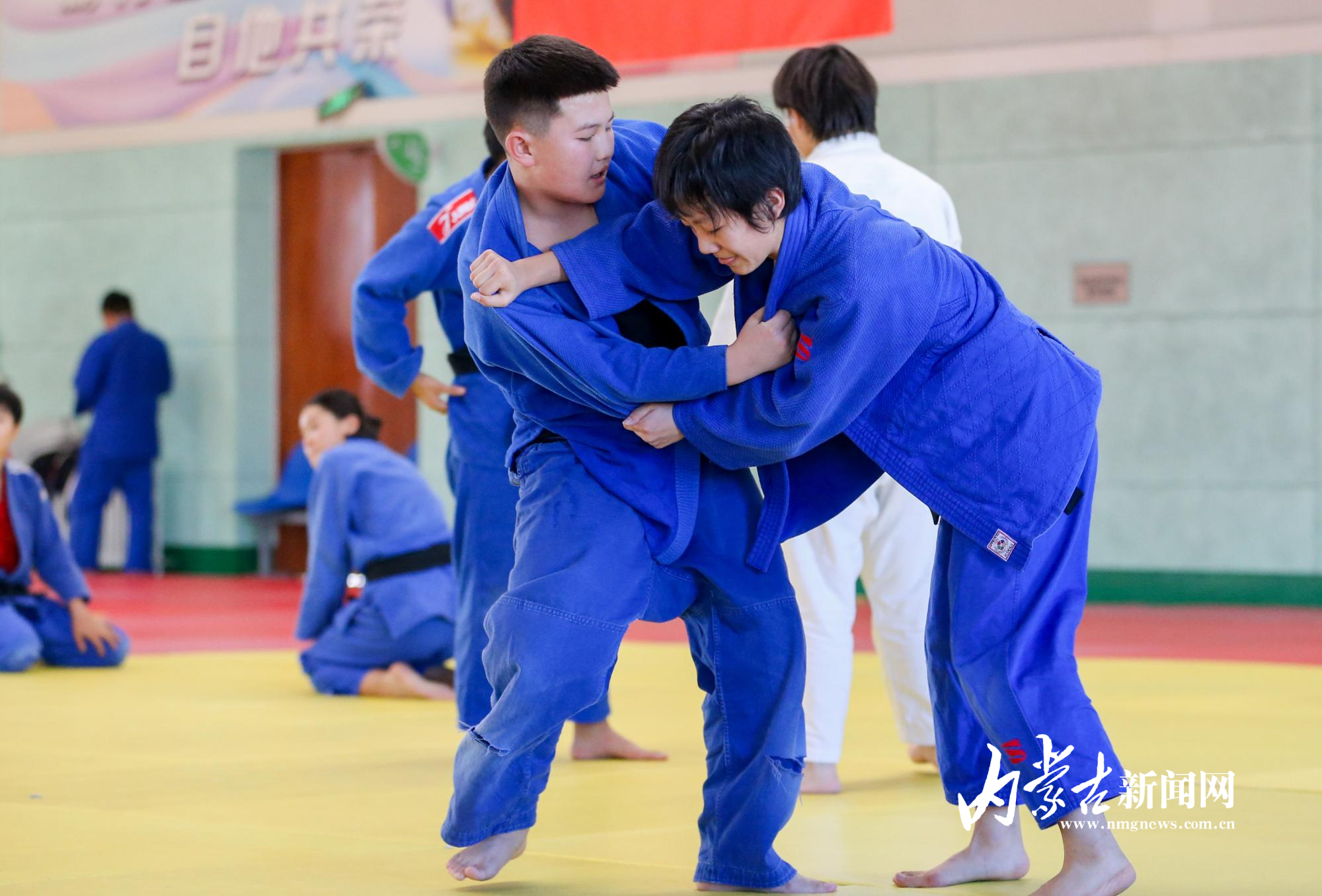 12月9日,在呼和浩特市体育运动学校柔道训练馆内,热火朝天的专项训练正在进行。垫子上,女队员身着蓝色训练服,两人一组,进行寝技(指地面缠斗技术)练习;另一边,刚结束实战对抗的男队员们撸起袖子,扛起沉甸甸的牛角沙袋,加强核心力量训练,汗水顺着脸颊滑落……