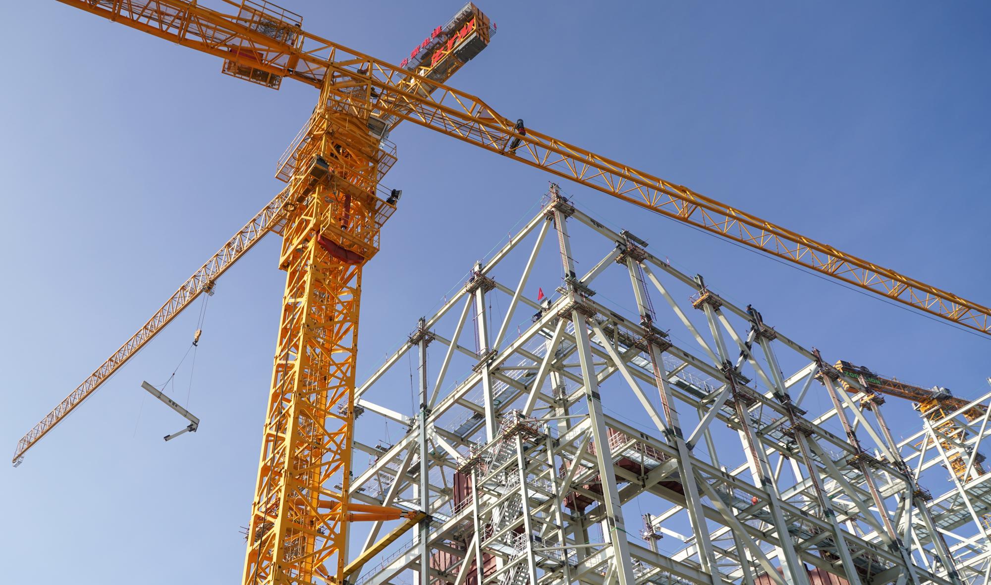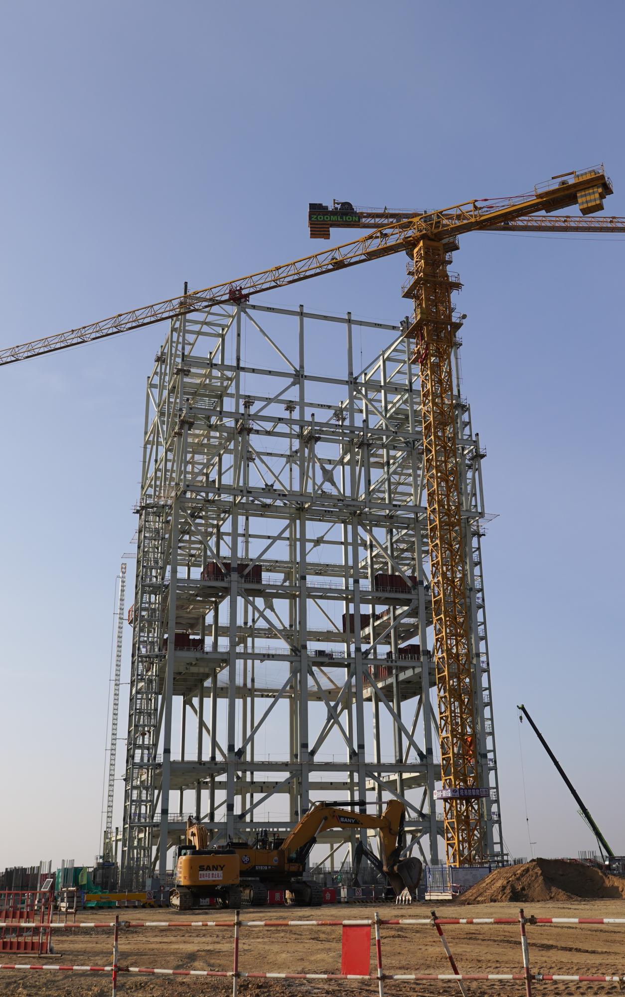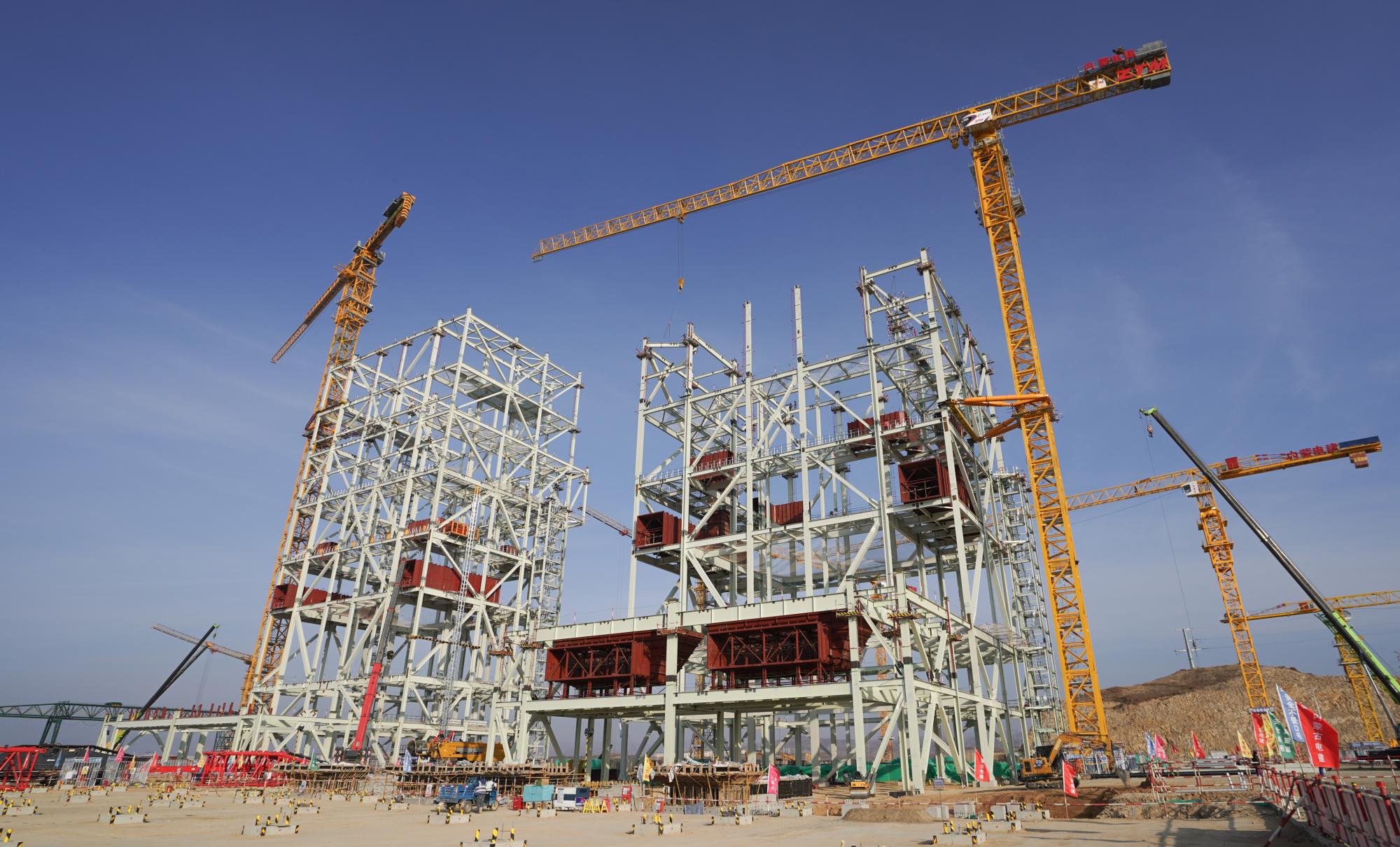 “这是项目的一号机组锅炉钢架,已经吊装至第八段,主厂房基础完成了大约70%。我们目前加紧施工,争取年底前一号锅炉钢架到顶,春节前二号锅炉钢架到顶,早日实现投产。”包头喜桂图发电公司副总经理周跃宇介绍。