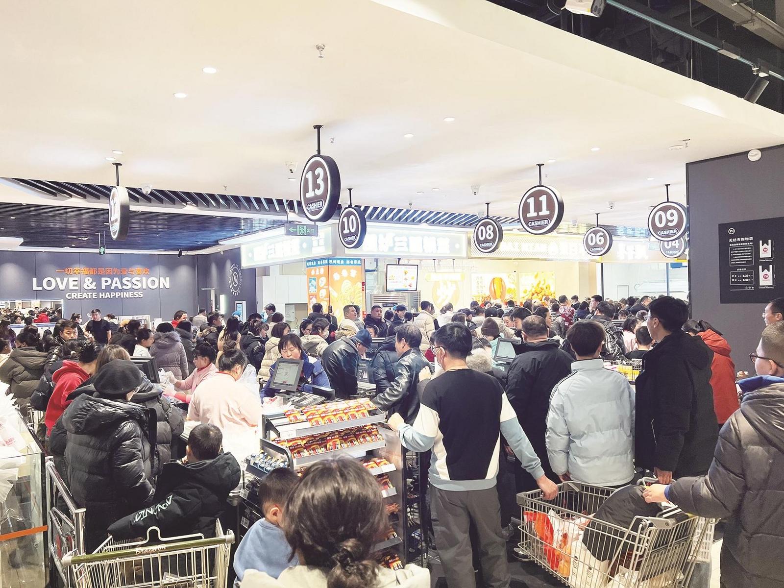 12月13日,记者在昆区吾悦广场永辉超市看到,该超市人头攒动,客流爆满,在超市外甚至排起了长龙。据了解,该超市学习胖东来自主调改后开业,吸引了众多消费者慕名而来。热闹的消费场景,展现出消费市场的旺盛活力,也折射出百姓对商品品质和服务需求的不断提高。 (李 强)