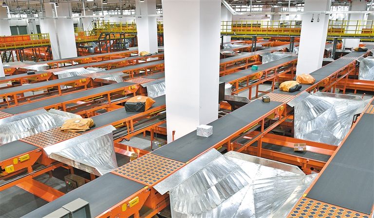 内蒙古圆通速递有限公司分拣中心内,自动化运输线正在进行快递分拣工作。