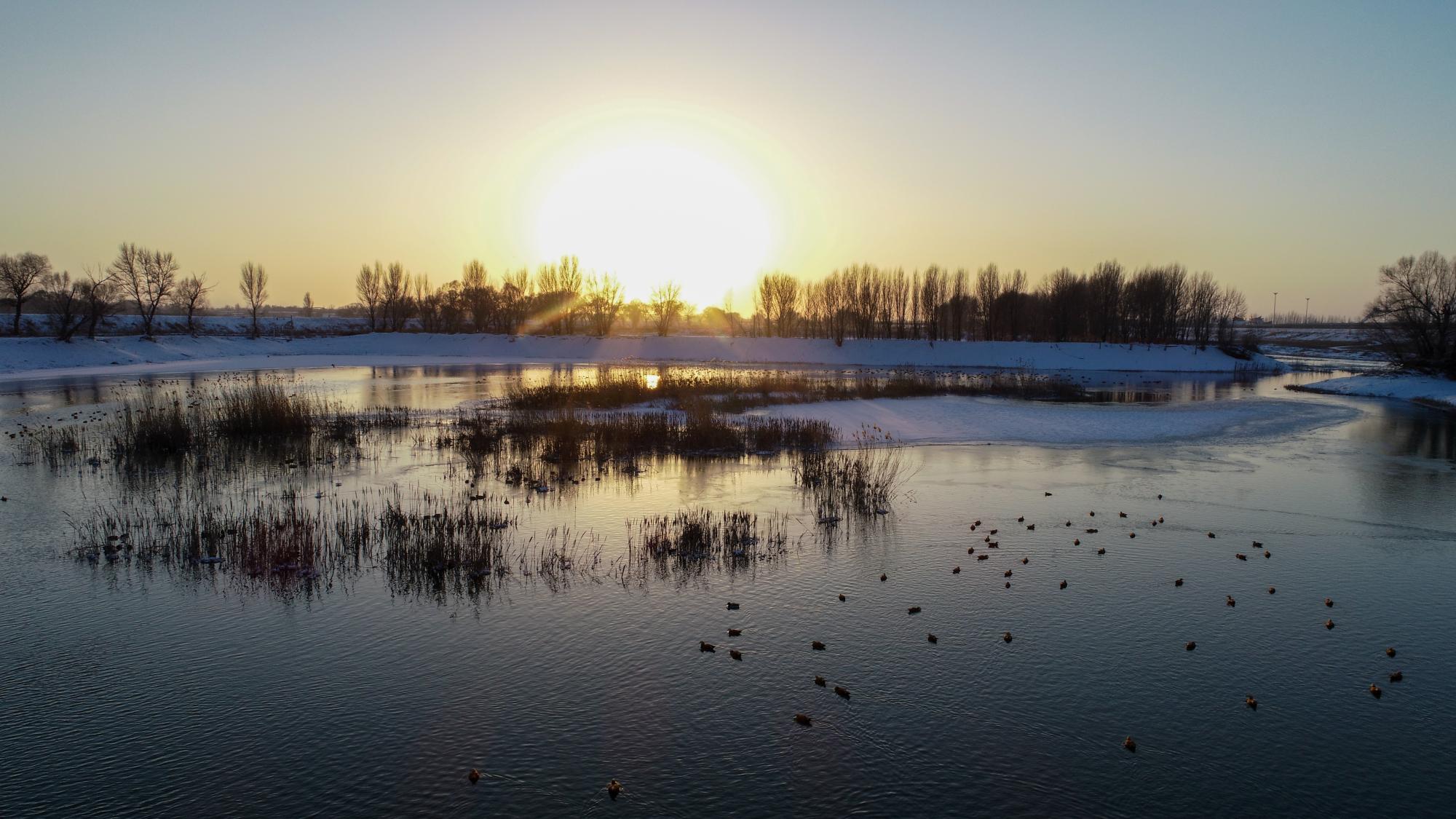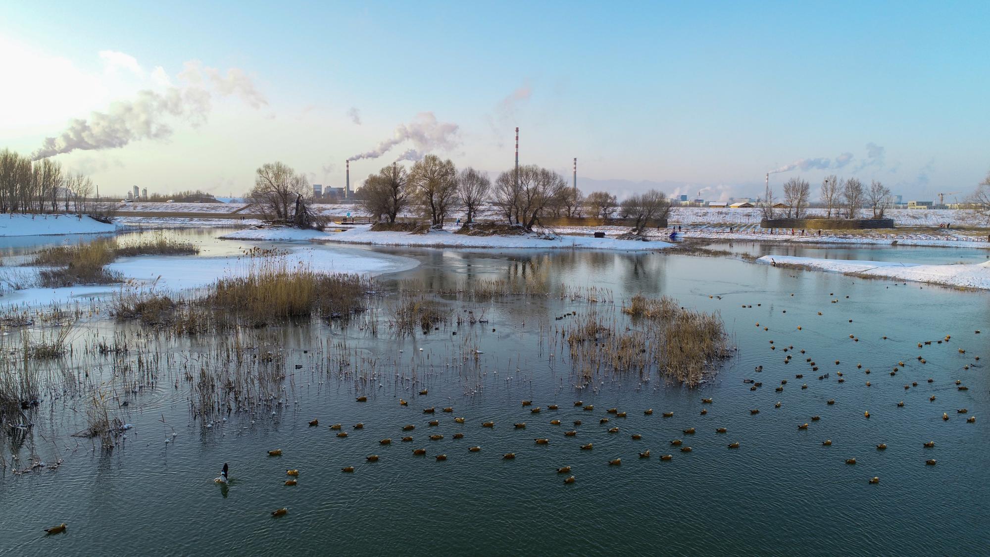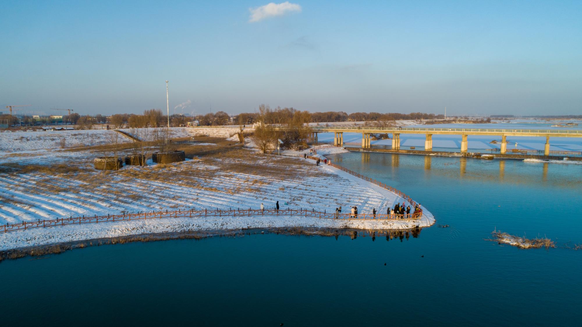 12月14日,呼和浩特市玉泉区大黑河郊野公园内的“千岛湖”,银装素裹的湖岸栈道与候鸟相映成趣,构成一幅绝美的水墨画卷。当天恰逢周末,市民游客络绎不绝,或沿木栈道漫步赏景,或举相机定格“水天一色、人鸟和谐”的瞬间。
