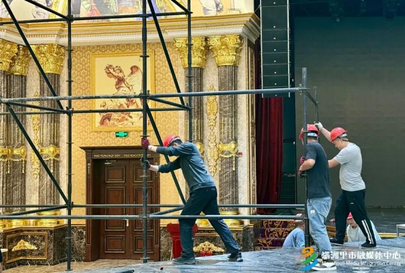 在活动现场,工人们各司其职、配合默契,有的合力抬运灯架部件对齐接口,有的蹲身拧紧固定螺栓,钢管碰撞的声响此起彼伏。谈及舞台设计,内蒙古广播电视台内蒙古卫视导演、套娃情选美大赛总导演武莹说:“我们在保留原有梯形台固定功能的基础上,通过多组矩形结构拼接做了表演面的延伸。比赛当天,现场既要呈现佳丽的服装展示,也有表演嘉宾的精彩演出,把舞台打造成立体的视听空间,能让观众沉浸式进行观赏。”