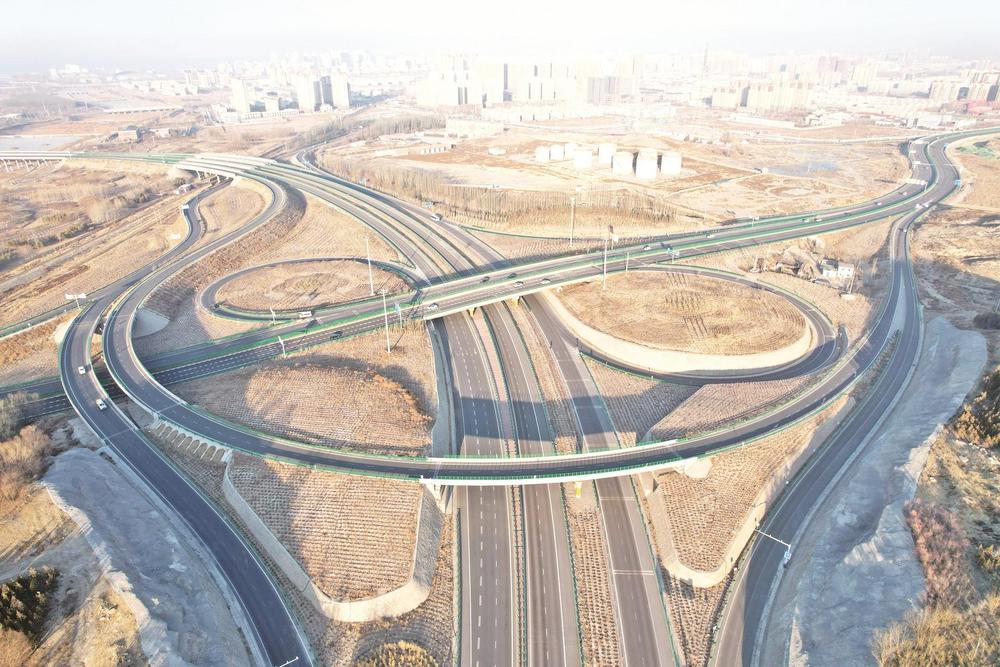 “十四五”期间,乌海市积极推进公路网结构优化,全市公路通车总里程达1151公里,公路网密度达65.6公里/百平方公里,为自治区平均水平的3.5倍,形成以高速公路、国省干线为骨架,农村公路、旅游公路、矿区道路为补充的“四横四纵五桥三路”公路网体系。图为S217海勃湾绕城段三厂互通立交桥(无人机照片)。