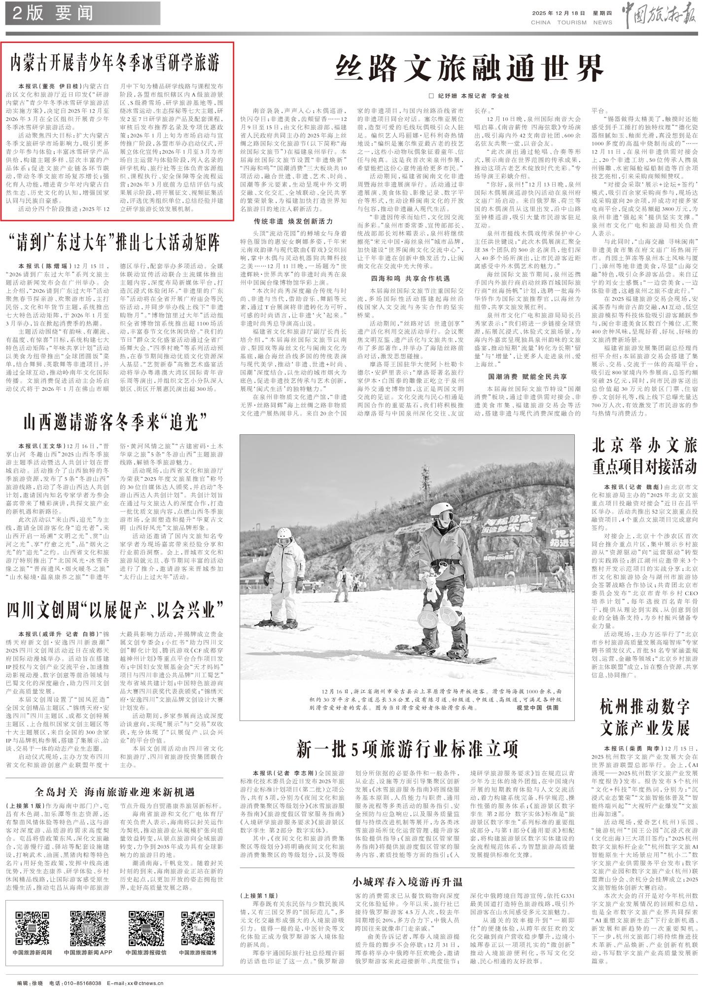 2025年12月18日《中国旅游报》第2版刊发了《内蒙古开展青少年冬季冰雪研学旅游》的文章,报道了内蒙古自治区文化和旅游厅近日印发《“研游内蒙古”青少年冬季冰雪研学旅游活动实施方案》,决定自2025年12月至2026年3月在全区组织开展青少年冬季冰雪研学旅游活动。