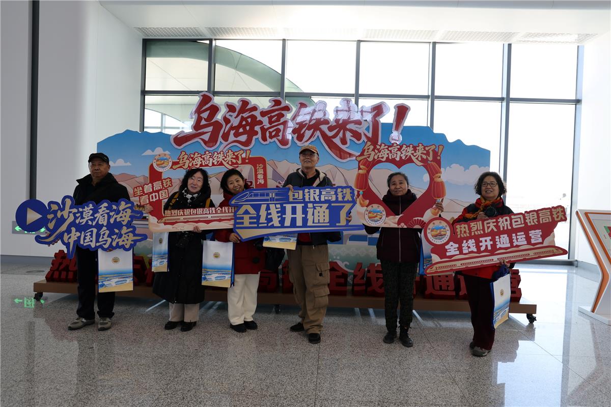 12月23日,旅客在乌海站宣传背景墙前拍照留念。