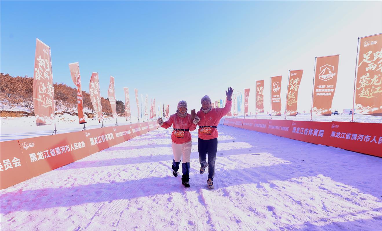 参赛选手携手向冰雪极寒穿越挑战赛终点冲刺。隋浩岩 摄