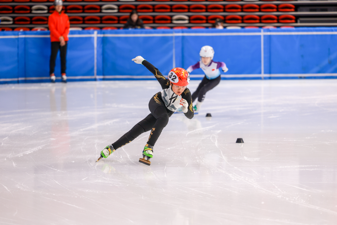 第十二届全国大众冰雪季呼和浩特市大众短道速度滑冰公开赛,选手正在全力冲刺。