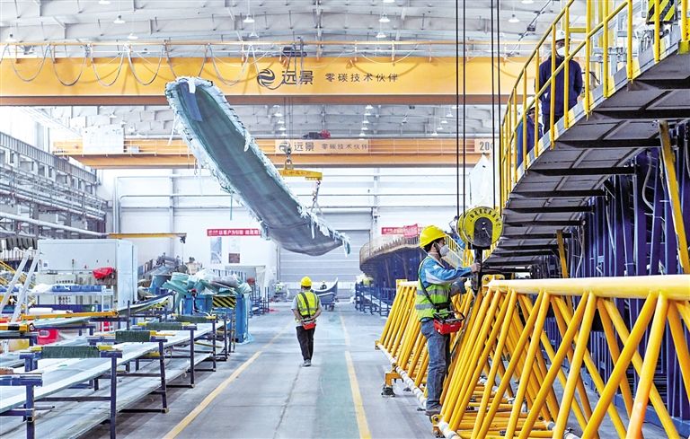 1月6日,在位于乌兰察布市察哈尔高新技术开发区的远景蒙新集团乌兰察布叶片生产基地,一片繁忙的生产景象。新年伊始,该基地的6条叶片生产线24小时满负荷运转,平均每天就有4至5支巨型叶片下线。据了解,该基地目前已具备年产1500支大兆瓦级风电叶片能力。草原云·内蒙古新闻网记者 王磊 摄