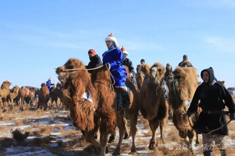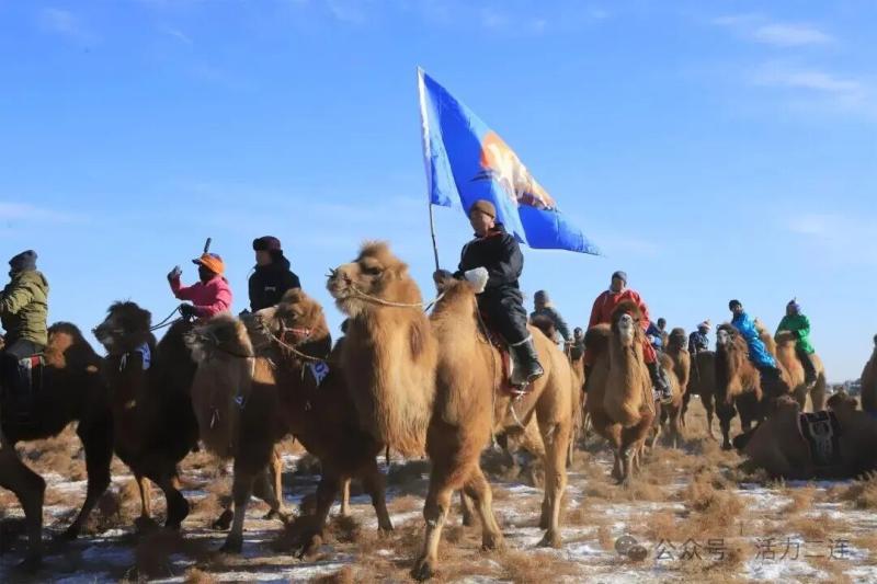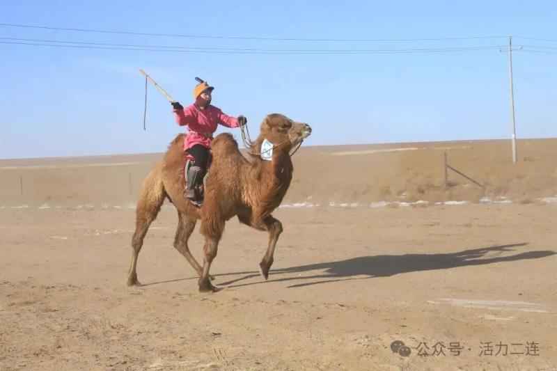 “各就位——出发!”随着口令响起,两岁骆驼竞速赛率先开启。赛场上既有身手矫健的女骑手,也有初登赛场的新人。赛驼奋力前冲,四蹄翻飞卷起阵阵雪雾,骑手们俯身驭驼、扬鞭策进,在洁白草原上划出一道道动感弧线。