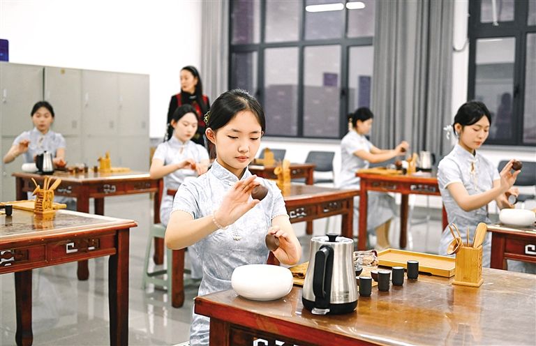 1月9日,旅游专业的学生在展示茶艺。当日,呼和浩特市文化艺术职业学校开展了专业课期末考试暨期末专业观摩活动。学生们以精彩的展演展示学习成果。近年来,呼和浩特市持续深化职业教育教学改革,积极构建“一核引领、三轴联动、全域贯通”发展格局,为经济社会发展提供人才支撑。草原云·内蒙古新闻网记者 王磊 摄