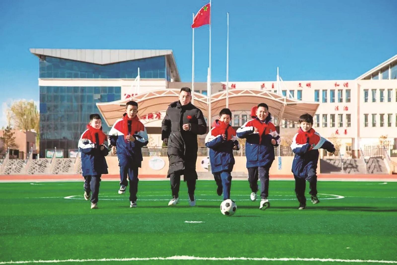 老师领着孩子们进行足球训练。