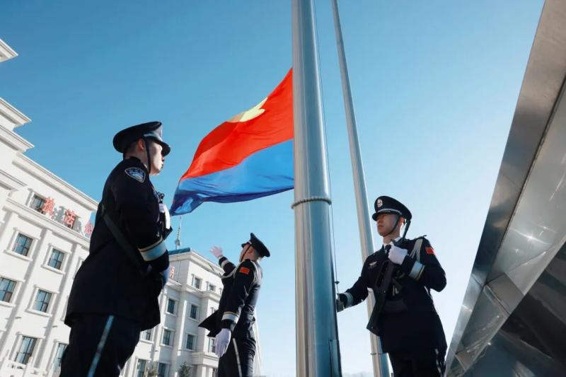 1月10日,阿拉善盟公安局举行升警旗仪式。现场气氛庄重热烈,全体民警辅警警容严整,在激昂的《中国人民警察警歌》声中,向冉冉升起的红蓝警旗敬礼,并重温入警誓词,表达了守护平安、践行使命的坚定决心。
