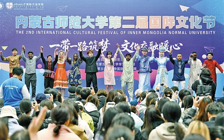 内蒙古师范大学第二届国际文化节上,孟丹和其他留学生们一起表演节目。