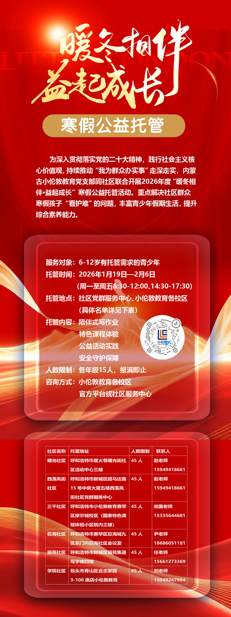 为切实解决双职工家庭、困难家庭寒假期间孩子“看护难”问题,深入推进“我为群众办实事”实践活动走深走实,1月19日至2月6日,内蒙古小伦敦教育党支部联合各社区启动2026年度“暖冬相伴·益起成长”寒假公益托管服务,以精准帮扶为抓手,为青少年打造安全、充实、有温度的假期生活。